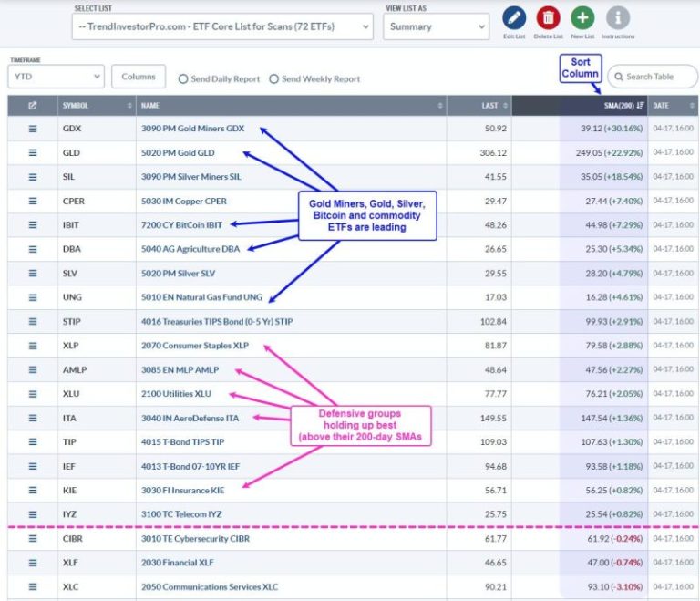 TrendInvestorPro works with a ChartList that has 72 ETFs covering all sectors, the key industry groups, commodities, bonds and crypto. Note that this curated ChartList is available to TrendInvestorPro subscribers. The image below is sorted by the percentage above the 200-day SMA (blue shading) to show the top 20 performers. This simple performance overview reveals a lot. We are NOT in a bull market and alternative assets are attracting attention (gold, Bitcoin).